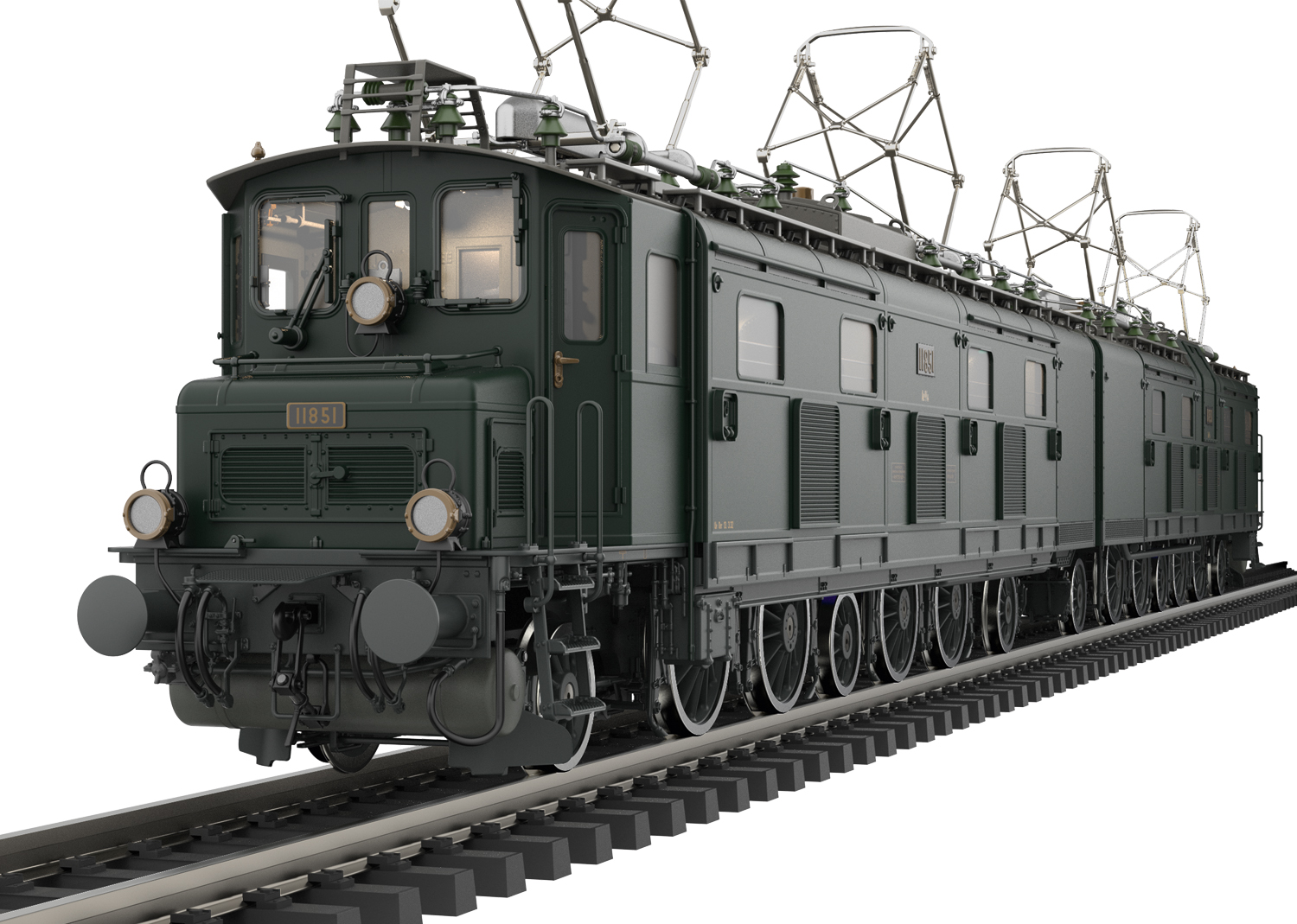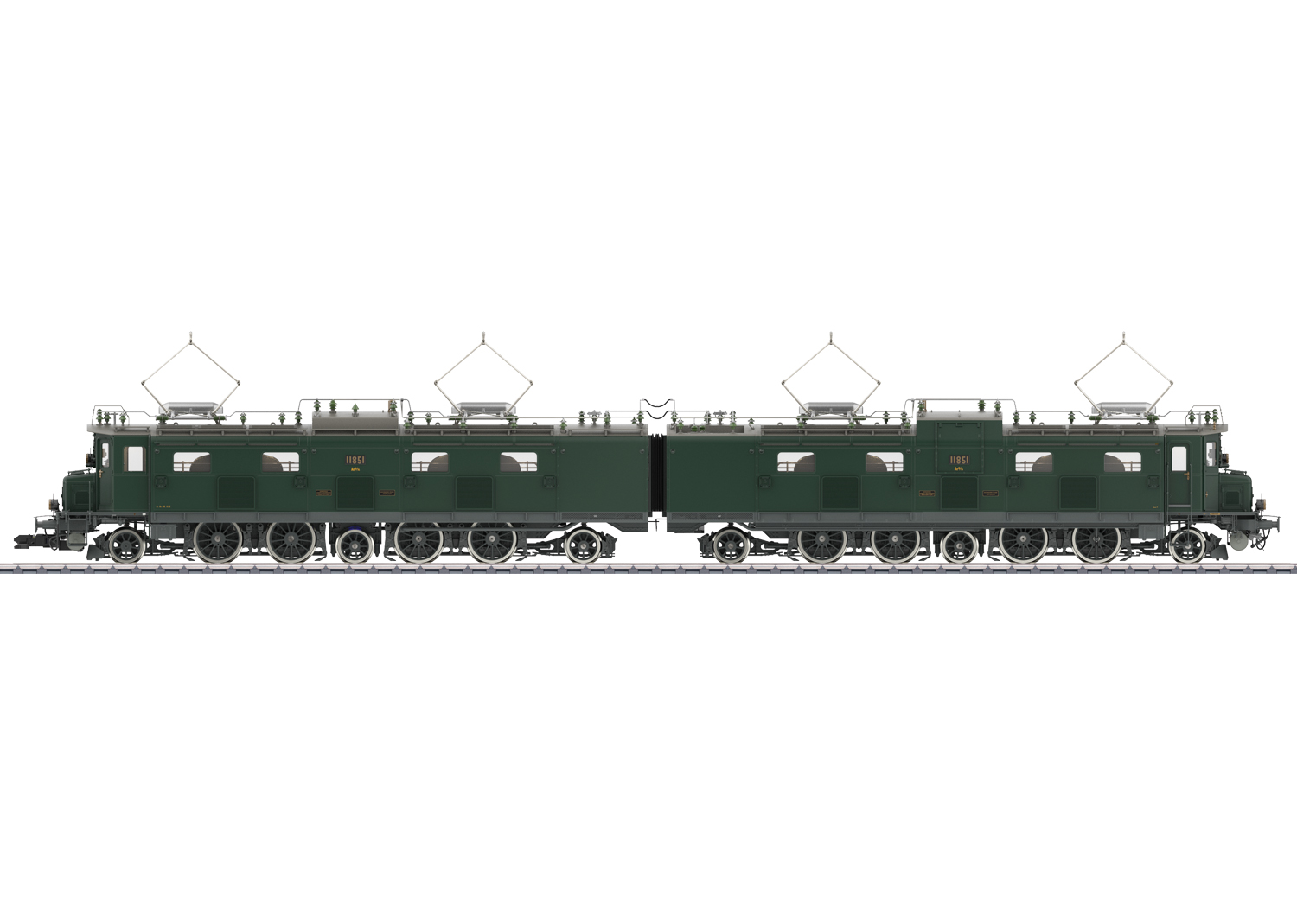 Voorbeeld: Elektrische locomotief type Ae 8/14 nr. 11851 van de Zwitserse Staatsspoorwegen (SBB). Zoals het model eruit zag na de in 1961 uitgevoerde ombouw van de cabines naar SBB cabines van type Ae 6/6. In de kleur dennengroen van Periode IV. Model zoals in bedrijf van 1969 tot 1976.