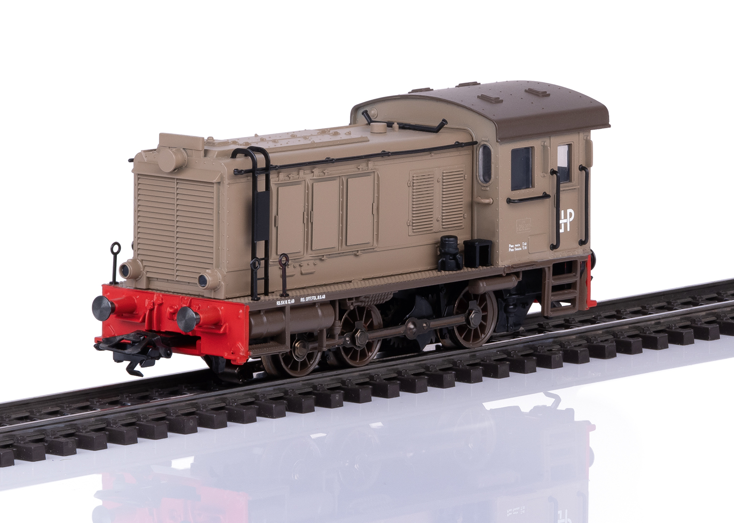 Vorbild: Zugpackung bestehend aus einer Diesellokomotive vom Typ V 36 und vier Fahrzeugtransportwagen Bauart Sm Augsburg (Austauschbauart). Lokomotive in brauner Grundfarbgebung angelehnt an die FS D 236. Betriebsnummer D 236.202. Fiktiver Betriebszustand ab 1948. Beladen mit acht Modellen des Porsche 356.