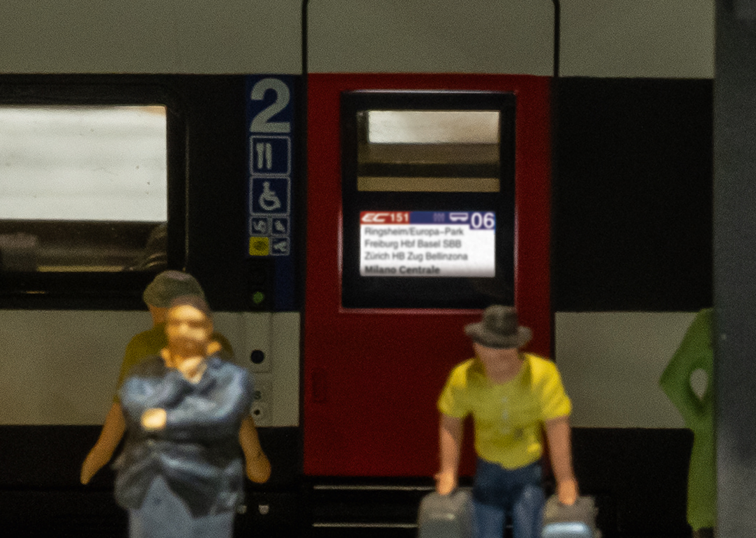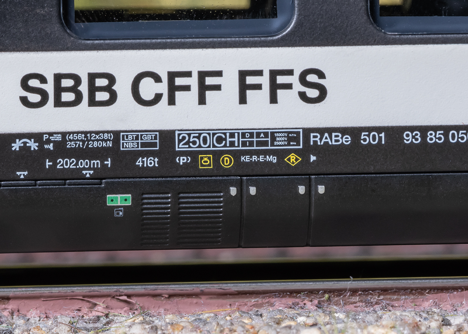 Voorbeeld: Elektrisch hogesnelheid treinstel EC 250 als RABe 501 'Giruno' van de Zwitserse Staatsspoorwegen (SBB). Eén stuurstandrijtuig A (Bt1), 2e klas. Eén tussenrijtuig F (B7), 2e klas, met instap geschikt voor minder valide reizigers en met pantograaf. Eén tussenrijtuig G (WR6), met restauratie afdeling. Één tussenrijtuig H (A5), 1e klas met instap geschikt voor minder valide reizigers en met pantograaf. Eén stuurstandrijtuig L (At2), 1e klas. Meer-systeem treinstel. Model van de EC 151, grensoverschrijdend treinstel voor het traject Frankfurt/Main - Freiburg - Basel - Zürich - Milano Centrale. Treinnummer RABe 501 022 met het wapen van het kanton Vaud. Model in de uitvoering omstreeks 2024.