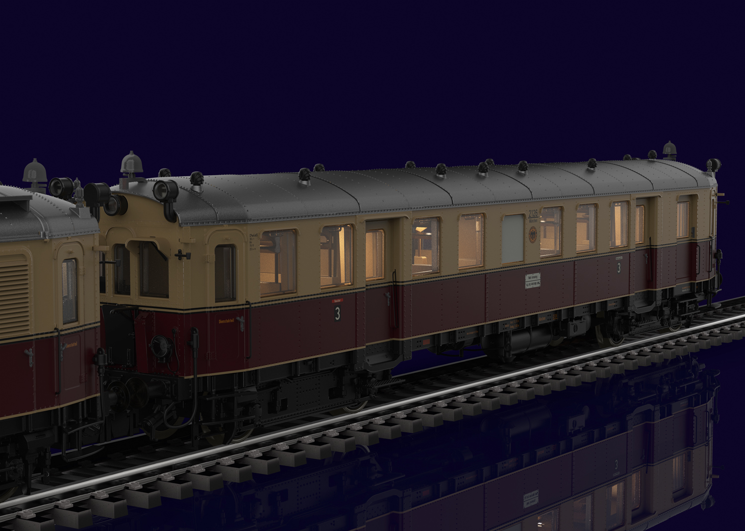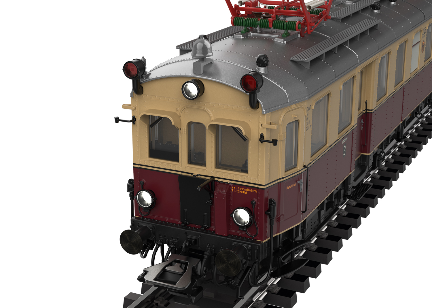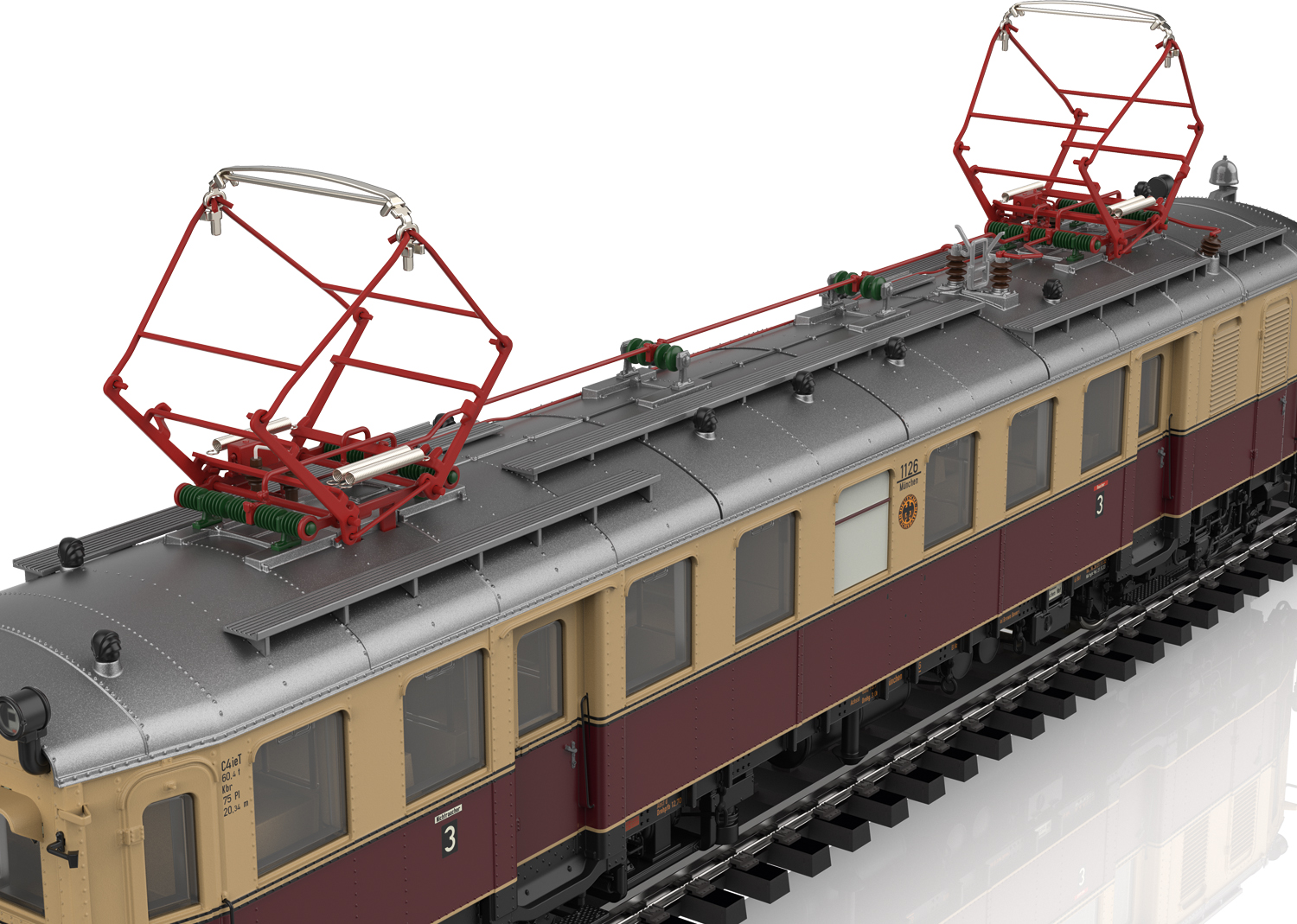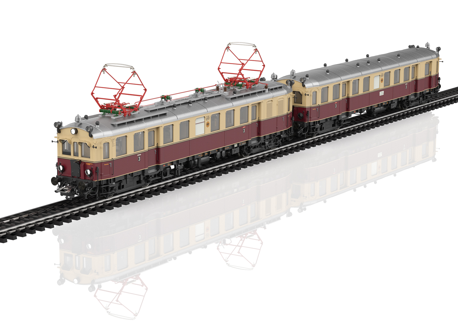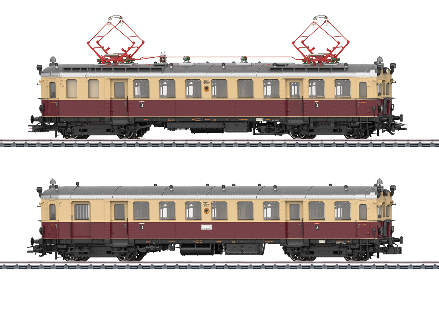 Voorbeeld: Elektrische motorwagen eLT met stuurstandrijtuig eLS van het Deutsche Reichsbahn Gesellschaft (DRG). Uitvoering met frontdeuren in de motorwagen en het stuurstandrijtuig en met overgangsbordessen. Met hoog geplaatste sluitlantaarns. Met de zandkisten op de originele plaats. Kleur beige/wijnrood. Wagennummers eLT 1126 en eLS 2126. Koersbord op het stuurstandrijtuig 'Naar Ismaning - naar München Ost Pbf'. Standplaats München. Model in de uitvoering van 1932.