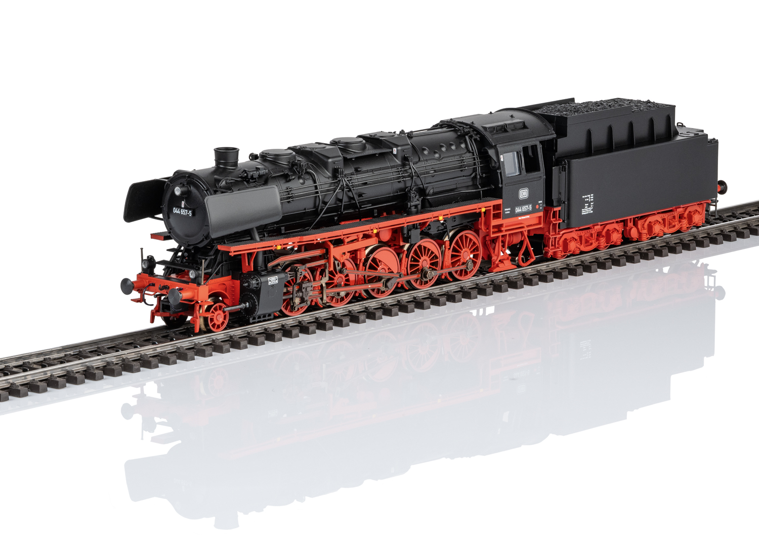 Voorbeeld: Zware stoomlocomotief voor de goederendienst type 044 met standaard kolentender 2'2'T34 van de Deutsche Bundesbahn (DB). Kleur zwart/rood. Met genormaliseerde Witte windleiplaten. Met voorloopas met spaakwielen maar zonder centrale vergrendeling op de rookkamerdeur. Met Indusi magneten aan beide zijden. Locomotiefnummer 044 657-5. Model in de uitvoering omstreeks 1973.