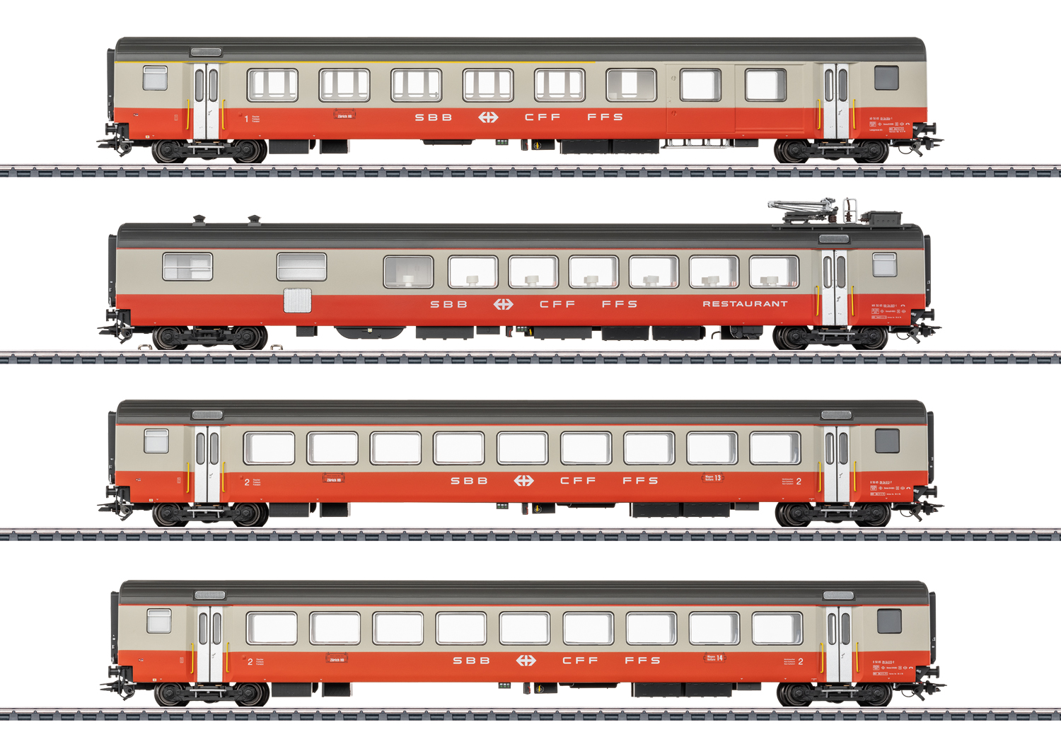 Voorbeeld: Vier standaard rijtuigen type EWIII van de Schweizerische Bundesbahnen (SBB/CFF/FFS). Eén half-bagagerijtuig type AD, 1e klas, één restauratiewagen type WR en twee afdelingsrijtuigen type B, 2e klas. In de kleuren kiezelgrijs/bloedoranje van de Swiss Express. Treinbestemming: Genève-Lausanne-Bern-Zürich HB. Wagen volgnummers 1, 13 en 14. Restauratiewagen zonder volgnummer. Modellen in de uitvoering vanaf 1975.