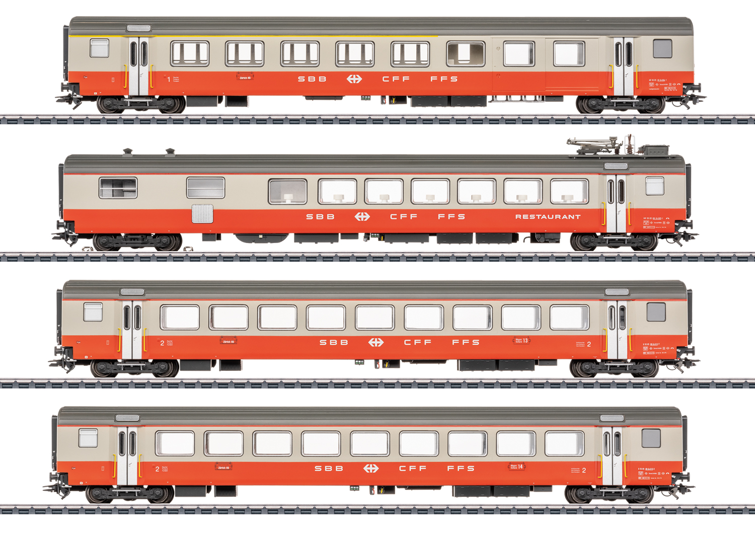 Voorbeeld: Vier standaard rijtuigen type EWIII van de Schweizerische Bundesbahnen (SBB/CFF/FFS). Eén half-bagagerijtuig type AD, 1e klas, één restauratiewagen type WR en twee afdelingsrijtuigen type B, 2e klas. In de kleuren kiezelgrijs/bloedoranje van de Swiss Express. Treinbestemming: Genève-Lausanne-Bern-Zürich HB. Wagen volgnummers 1, 13 en 14. Restauratiewagen zonder volgnummer. Modellen in de uitvoering vanaf 1975.