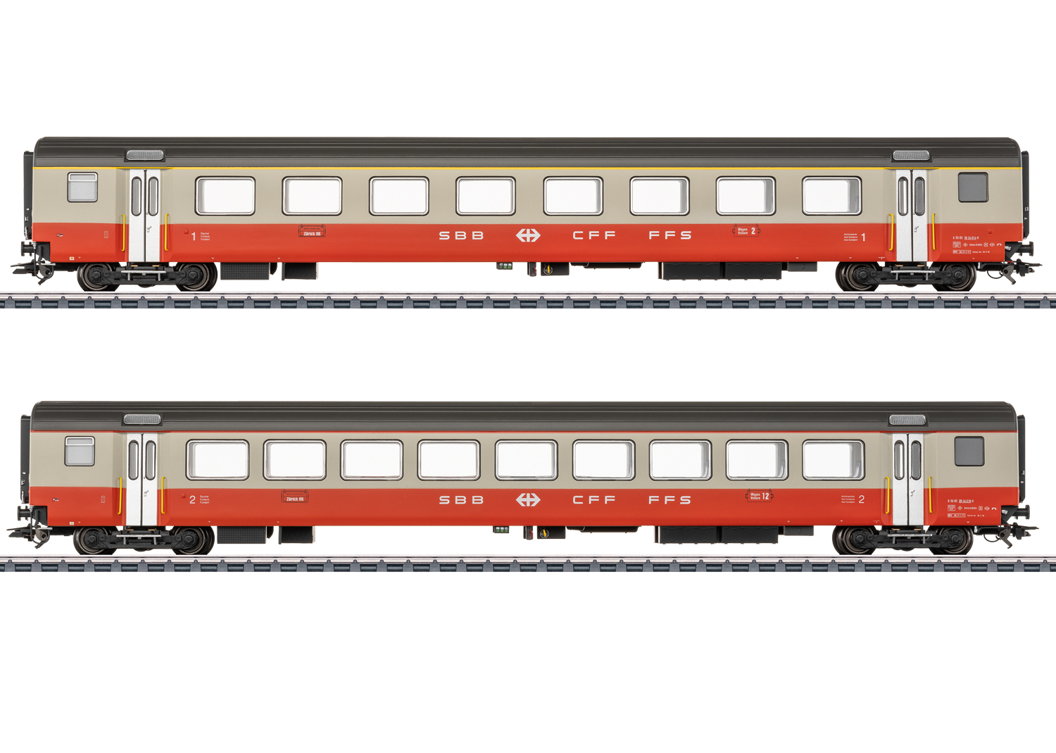 Voorbeeld: Twee standaard rijtuigen type EWIII van de Schweizerische Bundesbahnen (SBB/CFF/FFS). Eén afdelingsrijtuig type A, 1e klas en één afdelingsrijtuig type B, 2e klas. In de kleuren kiezelgrijs/bloeoranje van de Swiss Express. Treinbestemming: Genève-Lausanne-Bern-Zürich HB. Wagenvolgnummers 2 en 12. Modellen in de uitvoering vanaf 1975.
