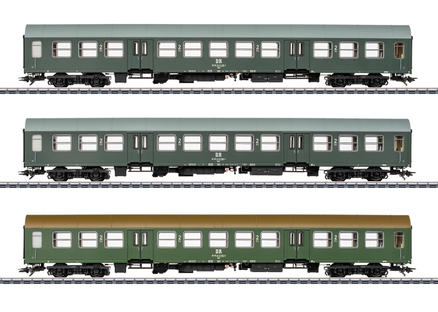 Voorbeeld: Drie rijtuigen type Bmh, 2e klas, van de Deutsche Reichsbahn (DR/DDR). Type Halberstadt met middeninstap. Twee rijtuigen in de kleur donkergroen (TGL 2233) en éen in de kleur chroomoxydegroen (TGL 2235). Model in de uitvoering eind van de jaren'80.