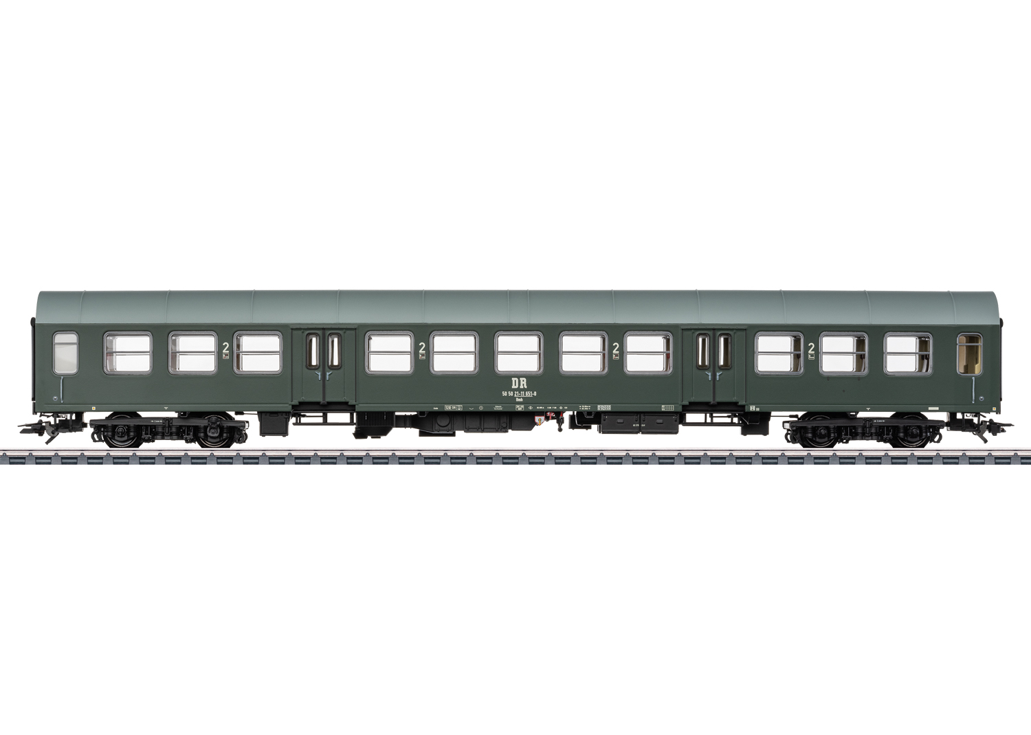 Voorbeeld: Rijtuig model Bmh, 2e klas, van de Deutsche Reichsbahn (DR/DDR). Rijtuigtype Halberstadt met middeninstap, kleur donkergroen (TGL 2233). Model in de uitvoering eind van de jaren '80.