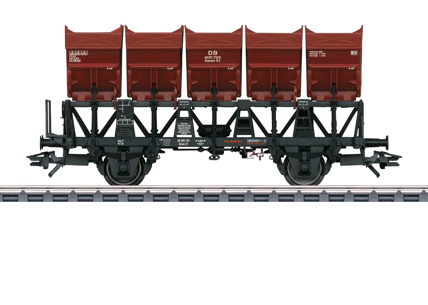 Voorbeeld: Tweeassige kantelbakwagen type Ommi 51 van de Deutsche Bundesbahn (DB). Met handrem en remcabine, zonder railtangen. Zoals in gebruik rond 1960.