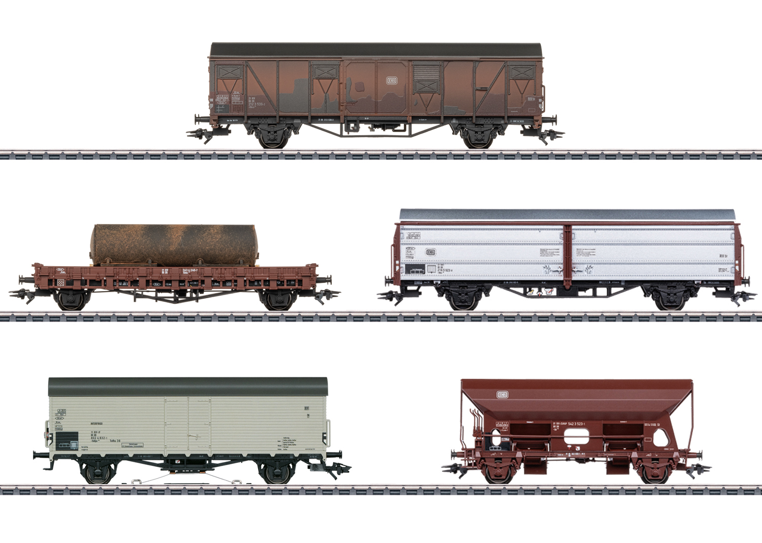 Voorbeeld: Vijf twee-assige goederenwagens van verschillende modellen van de Deutsche Bundesbahn (DB). Eén gesloten goederenwagen met zijdeuren en plaatwanden type Hbcs 300. Eén open goederenwagen met zijboorden type Klms 440 met lading. Eén schuifwandwagen type Hbis 299. Een open zelflosser type Ed 090. Eén koelwagen type Ibdlps 383 met rechte wanden. Modellen in de uitvoering midden/eind van de jaren '70.