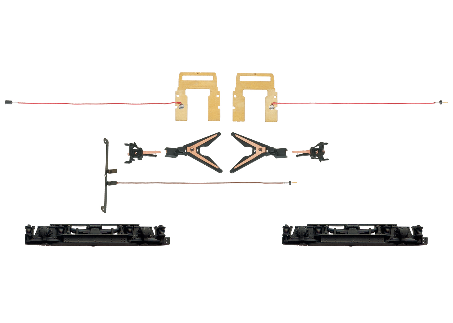 Inhoud: Twee stroom geleidende kortkoppelingen voor Norm-koppelingsschachten met contacten, 2 koppelingsgeleiders met ingebouwde contactveren, 2 afstandsplaatjes met gesoldeerde bedrading, een massa-veercontact voor het draaistel met gesoldeerde kabel en een montagehandleiding.